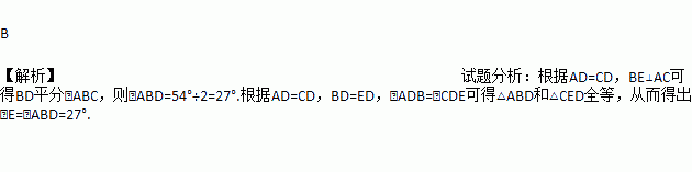 如图所示,BE⊥AC于点D,且AD=CD,BD=ED,若∠ABC=54°,则∠E=( )