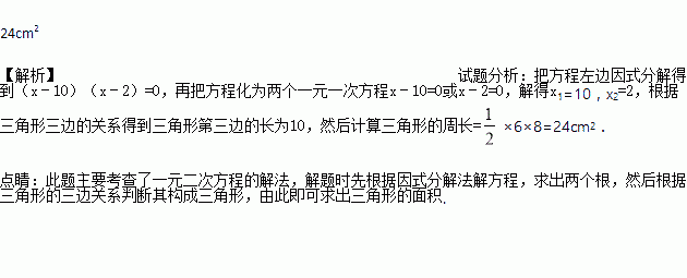 三角形两边的长分别是8cm和6cm,第三边的 长是方程x²-12x+20=0的一个实数根,则三角形的面积是_______