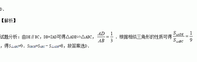 如图,在△ABC中,DE∥BC,DB=2AD,△ADE的面积为1,则四边形DBCE的面积为( )