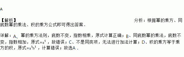 A. (a2)3=a6 B. a2•a3=a6 C. a3+a4=a7 D. (ab)3=ab3