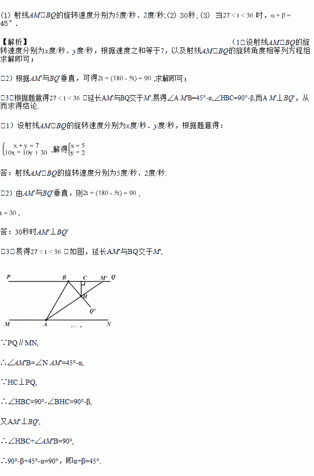 (1)如果射线BQ 先转动30°后,射线AM、BQ′再同时旋转10秒时,射线AM′与BQ′第一次出现平行.求射线AM、BQ的旋转速度;