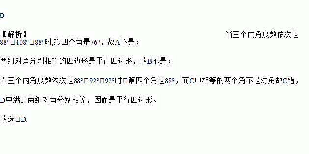 A. 88¡ã£¬108¡ã£¬88¡ã B. 88¡ã£¬104¡ã£¬88¡ã