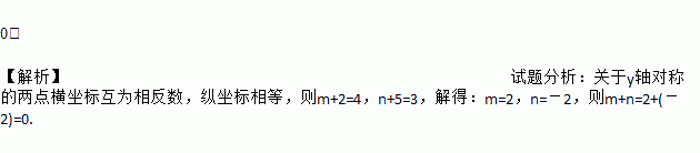 0. 【解析】试题分析:关于y轴对称的两点横坐标互为相反数,纵坐标相等,则m+2=4,n+5=3,解得:m=2,n=-2,则m+n=2+(-2)=0.