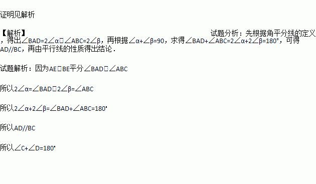 如图AE平分∠BAD,BE平分∠ABC,∠α+∠β=900,试说明∠C+∠D=1800,