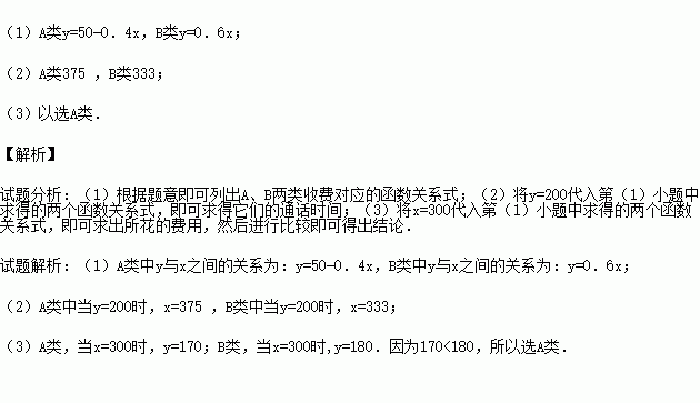 ijµçÐŹ«Ë¾ÊÖ»úµÄAÀàÊշѱê×¼ÈçÏ£ºÃ¿²¿ÊÖ»úÿÔ½ÉÄÉÔÂ×â50Ôª£¬ÁíÍâÿͨ»°1·ÖÖӽɷÑ0£®4Ôª£»BÀàÊշѱê×¼ÈçÏ£ºÃ»ÓÐÔÂ×â·Ñ£¬µ«Ã¿Í¨»°1·ÖÖӽɷÑ0£®6Ôª£®