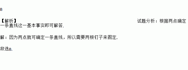 B 【解析】试题分析:根据两点确定一条直线这一基本事实即可解答. 【解析】 因为两点就可确定一条直线,所以需要两根钉子来固定. 故选B.
