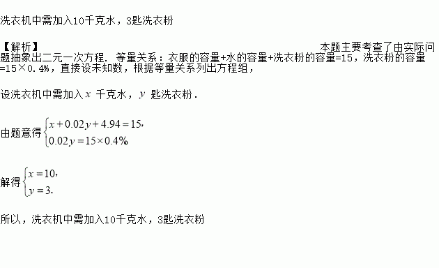 ,那么洗衣机中需要加入多少千克水,多少匙洗衣粉?(1匙洗衣粉约0.02kg,假设洗衣机以最大容量洗涤)