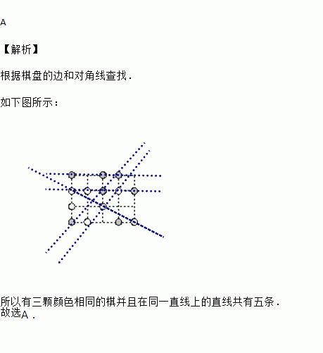 如图,棋盘上有灰、白两色棋子若干,找出有三颗颜色相同的棋在同一直线上的直线,这样的直线共有( )