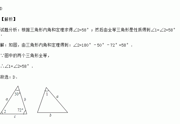 D 【解析】 试题分析:根据三角形内角和定理求得∠2=58°;然后由全等三角形是性质得到∠1=∠2=58°. 【解析】 如图,由三角形内角和定理得到:∠2=180°﹣50°﹣72°=58°. ∵图中的两个三角形全等, ∴∠1=∠2=58°. 故选:D.