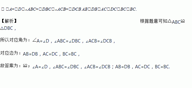 如图△ABC,使A与D重合,则△ABC______△DBC,其对应角为_____,对应边是_______.