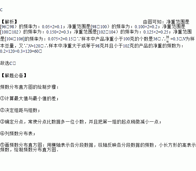 方图,其中产品净重的范围是[96,106](即96≤净重≤106),样本数据分组为[96,98)(即96≤净重<98)以下类似,[98,100),[100,102),[102,104),[104,106],已知样本中产品净重小于100克的个数是36,则样本中净重大于或等于98克并且小于104克的产品的个数是( )