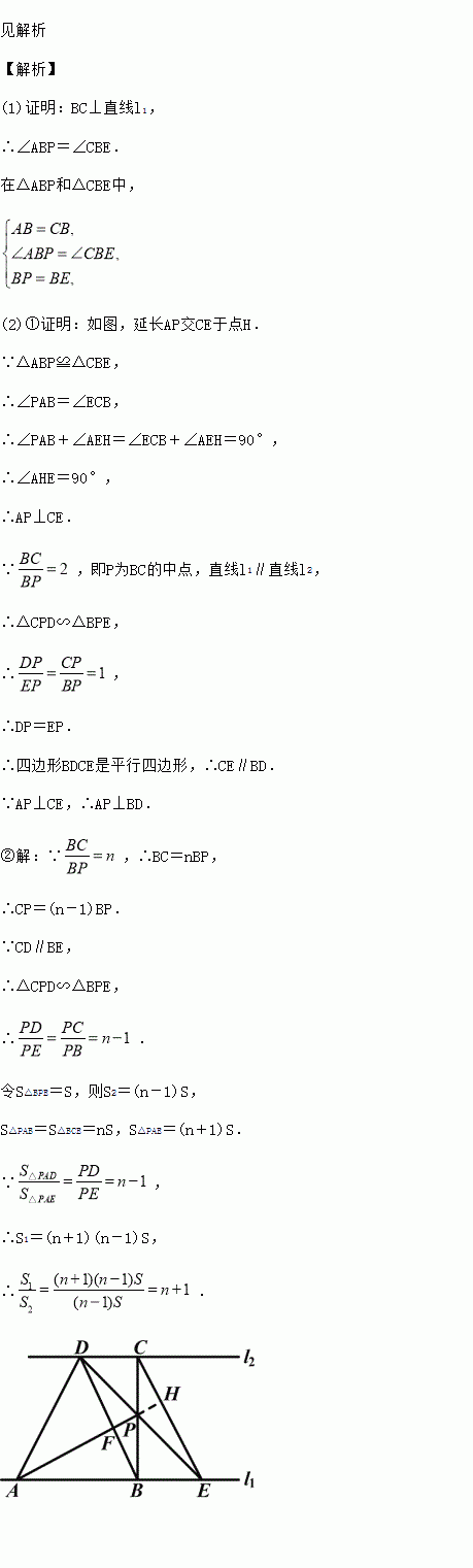 (2014四川资阳)如图①,已知直线l1∥l2,线段AB在直线l1上,BC垂直于l1交l2于点C,且AB=BC,P是线段BC上异于两端点的一点,过点P的直线分别交l2,l1于点D,E(点A,E位于点B的两侧,满足BP=BE,连接AP,CE.