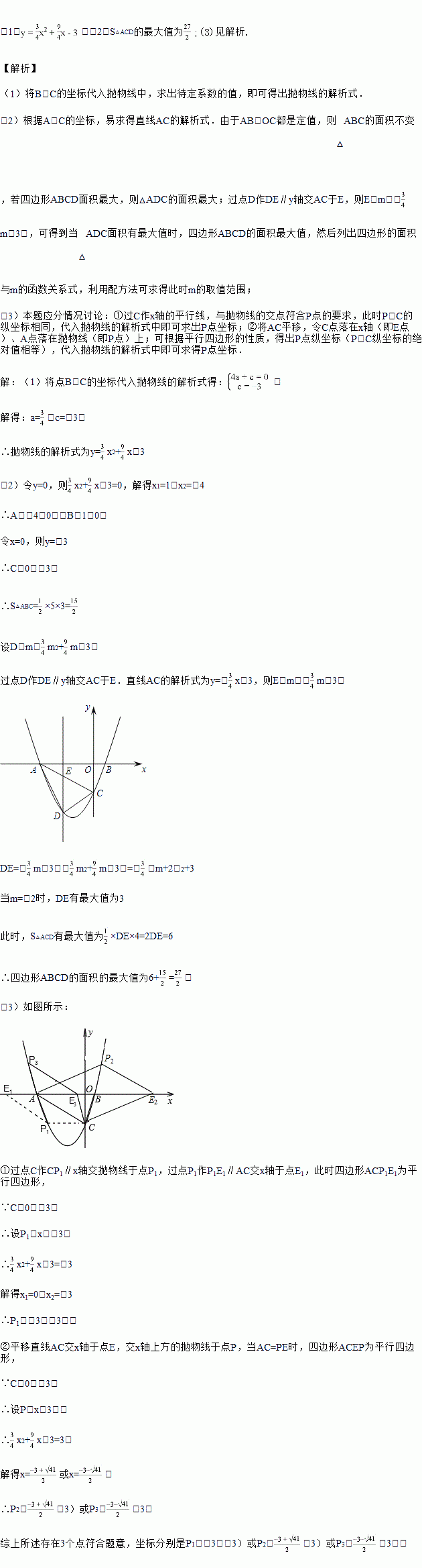 (3) 若点E在x轴上,点P在抛物线上,是否存在以A、C、E、P为顶点且以AC为一边的平行四边形?若存在,求点P的坐标;若不存在,请说明理由.