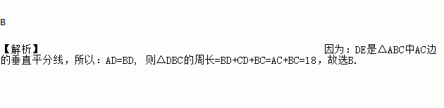 B 【解析】因为:DE是△ABC中AC边的垂直平分线,所以:AD=BD, 则△DBC的周长=BD+CD+BC=AC+BC=18,故选B.