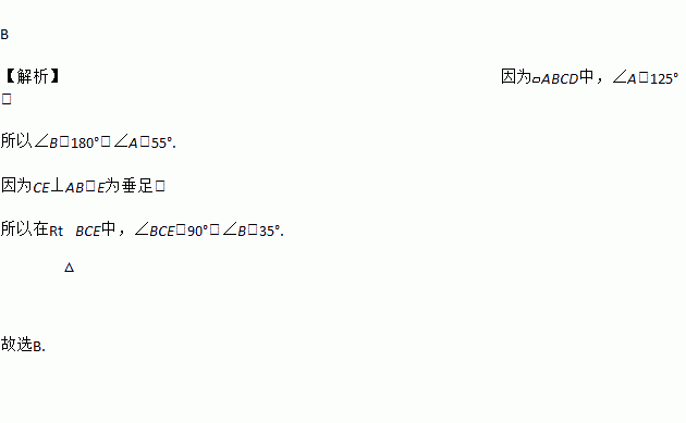 如图 所示,在?ABCD中,CE⊥AB,E为垂足.若∠A=125°,则∠BCE等于( )