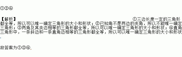 ¢Ù¢Û¢Ü ¡¾½âÎö¡¿¢ÙÈý±ß³¤¶ÈÒ»¶¨µÄÈý½ÇÐζ¼È«µÈ£¬ËùÒÔ¿ÉÒÔΨһȷ¶¨Èý½ÇÐεĴóСºÍÐÎ×´£»¢ÚÒÑÖª½Ç²»ÊÇÁ½±ßµÄ¼Ð½Ç£¬ËùÒÔ²»ÄÜΨһȷ¶¨Èý½ÇÐΣ»¢ÛÁ½½Ç¼°Æä¼Ð±ßÏàµÈµÄÈý½ÇÐζ¼È«µÈ£¬ËùÒÔ¿ÉÒÔΨһȷ¶¨Èý½ÇÐεĴóСºÍÐÎ×´£»¢ÜÖ±½ÇÈý½ÇÐÎÖУ¬Ò»Ìõб±ßºÍÒ»ÌõÖ±½Ç±ßÏàµÈµÄÈý½ÇÐζ¼È«µÈ£¬ËùÒÔ¿ÉÒÔΨһȷ¶¨Èý½ÇÐεĴóСºÍÐÎ×´. ¹Ê´ð°¸Îª¢Ù¢Û¢Ü.