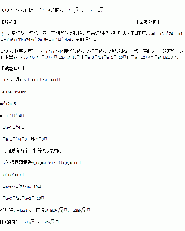 (1)证明见解析;(2)a的值为﹣2+ 或﹣2﹣. 【解析】【试题分析】 (1)欲证明方程总有两个不相等的实数根,只需证明根的判别式大于0即可. △=(a+3)2﹣4(a+1)=a2+6a+9﹣4a﹣4=a2+2a+5=(a+1)2+4>0,从而得证; (2)根据韦达定理,将x12+x22=10转化为两根之和与两根之积的形式,代入得到关于a的方程,从而求出a即可. x12+x22...