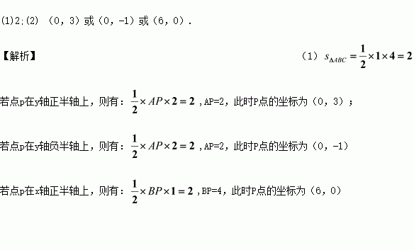 (10分)已知:在平面直角坐标系中, A(0,1),B(2,0),C(-2,0)(1)求△ABC的面积;(2)设点P在坐标轴上(不与C重合),且△ABP与△ABC的面积相等,求点P的坐标.