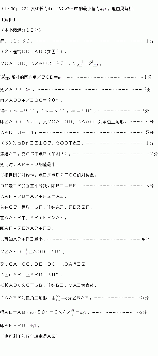 (3)P是半径OC上一动点,连结AP、PD,请求出AP+PD的最小值,并说明理由.