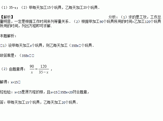 甲乙两人加工同一种玩具,甲加工90个玩具所用的时间与乙加工120个玩具所用的时间相等,已知甲乙两人每天共加工35个玩具,设甲每天加工x个玩具: