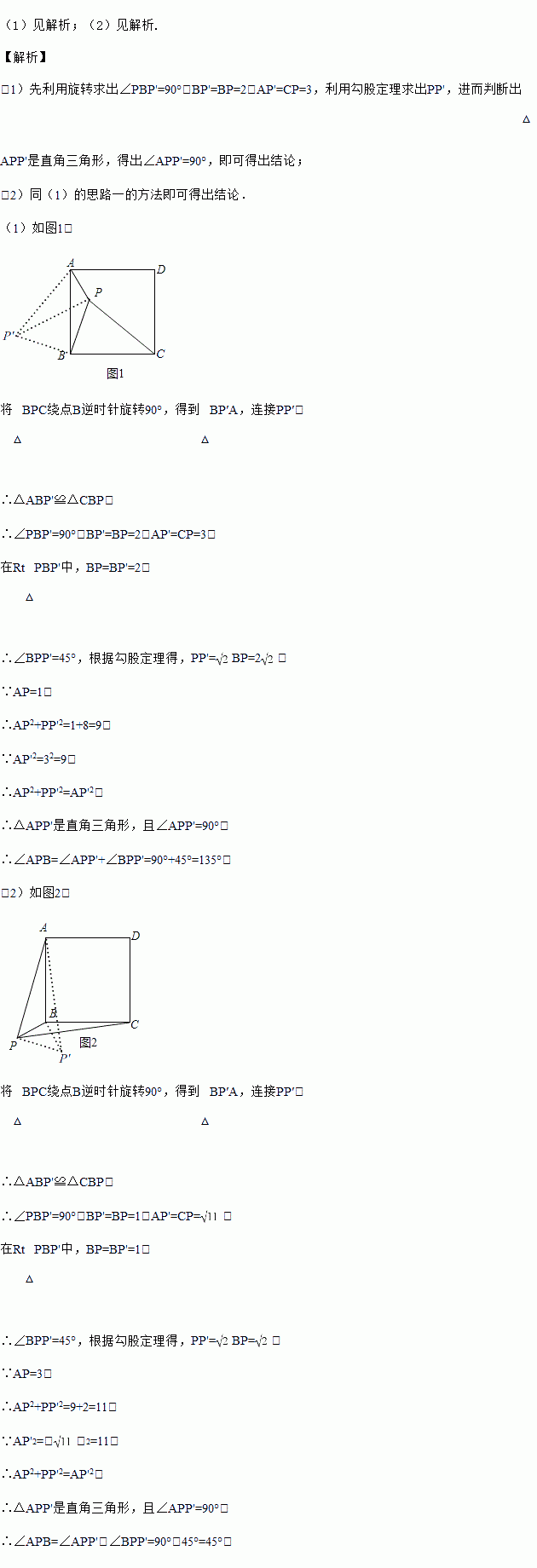 思路二:将△APB绕点B顺时针旋转90°,得到△CP'B,连接PP′,求出∠APB的度数.