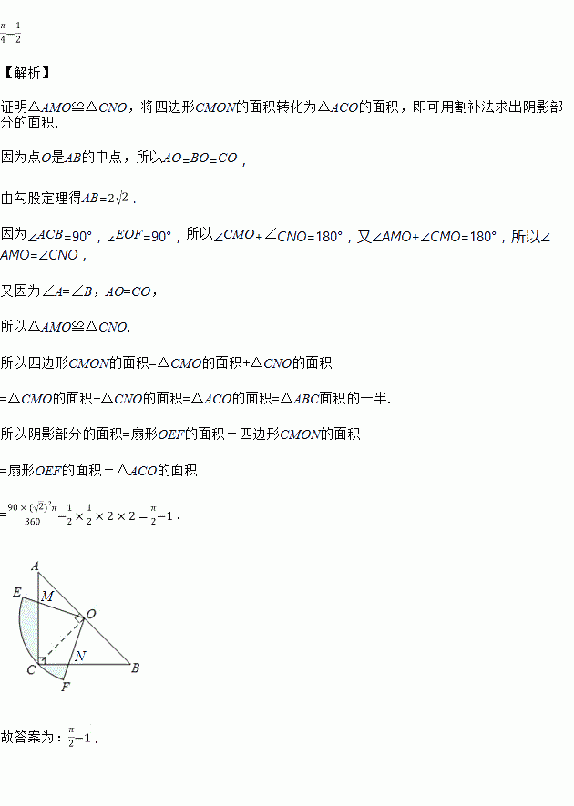如图,在△ABC中,∠C=90°,AC=BC,斜边AB=2,O是AB的中点,以O为圆心,线段OC的长为半径画圆心角为90°的扇形OEF,弧EF经过点C,则图中阴影部分的面积为________.