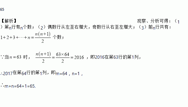65 【解析】观察、分析可得:(1)第n行有n个数;(2)偶数行从左至右增大,奇数行从右至左增大;(3)前n行共有: 个数; ∵当时, ,即2016在第63行的第1列, ∴2017在第64行的第1列,即m=64,n=1, ∴m+n=64+1=65.