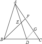 分析:先过D作DG∥BF,交AC于G,设S△AEF=x,S△CDG=y,由于△ABC的面积为60,BD=2CD,可求S△ABD,S△ACD,又E是AD中点,可求S△ABE.在△ADG中,DG∥BF,E是AD中点,利用平行线分线段成比例定理的推论,可知AF=FG,从而可知△AEF∽△ADG,再利用相似三角形的面积比等于相似比的平方,可得∴S△ADG=4x,同理可求S△BCF=9y,再利用三角形面积之间的加减关系可得关于x、y的二元一次方程,解即可.