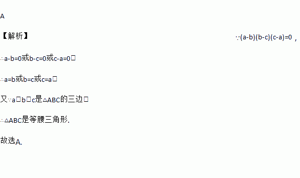 A 【解析】∵(a-b)(b-c)(c-a)=0, ∴a-b=0或b-c=0或c-a=0, ∴a=b或b=c或c=a, 又∵a、b、c是△ABC的三边, ∴△ABC是等腰三角形. 故选A.
