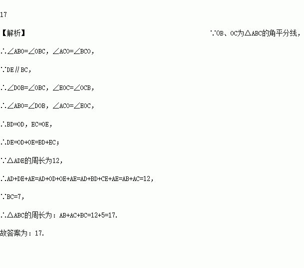 如图,已知0B、OC为△ABC的角平分线,DE∥BC交AB、AC于D、E,△ADE的周长为12,BC长为5,则△ABC的周长__.