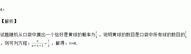 (2013年四川泸州4分)在一只不透明的口袋中放入红球6个,黑球2个,黄球n个,这些球除颜色不同外,其它无任何差别.搅匀后随机从中摸出一个恰好是黄球的概率为,则放入口袋中的黄球总数n= .