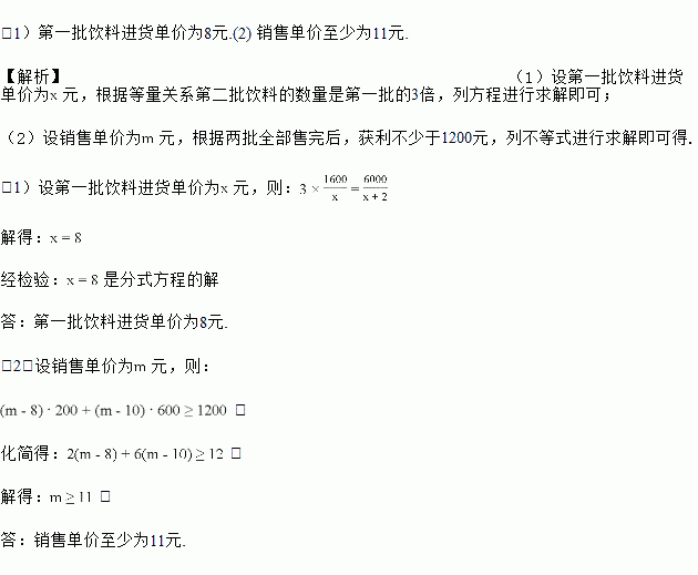 (2)若二次购进饮料按同一价格销售,两批全部售完后,获利不少于1200元,那么销售单价至少为多少元?