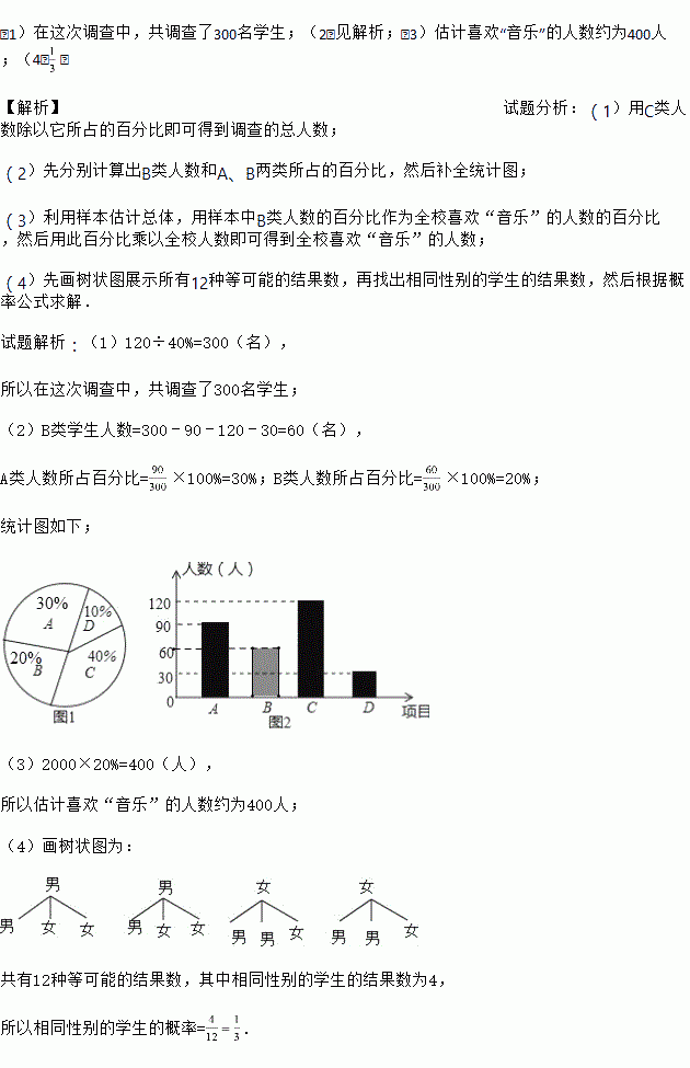 (3)若本校一共有2000名学生,请估计喜欢“音乐”的人数;