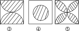 为创建绿色校园,学校决定在一块正方形的空地上种植花草,现向学生征集设计图案.图案要求只能用圆弧在正方形内加以设计,使正方形和所画的图弧构成的图案,是轴对称图形.种植花草部分用阴影表示.请你在图③、图④、图⑤中画出三种不同的设计图案.提示:在两个图案中,只有半径变化而圆心不变的图案属于同一种,例如:图①、图②只能算一种.