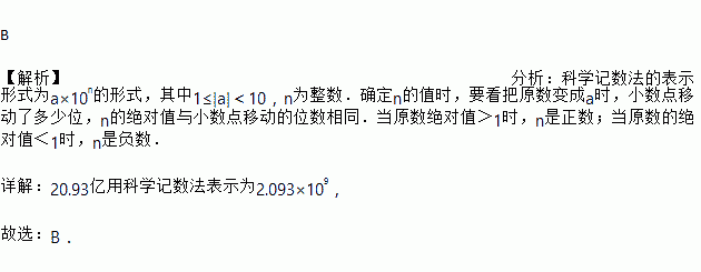 根据义务教育均衡发展要求泗县政府从2014年至2017年共投资20.93亿元对全县所有学校进行全面改造,20.93亿用科学记数法表示为( )