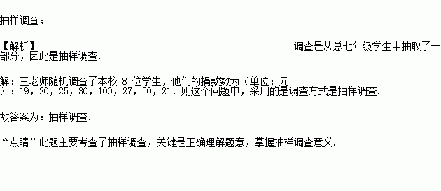 为了解学生为地震灾区捐款的情况,王老师随机调查了本校 8 位学生,他们的捐款数为(单位:元):19,20,25,30,100,27,50,21.在这个问题中,王老师采用的调查方式是 ______.