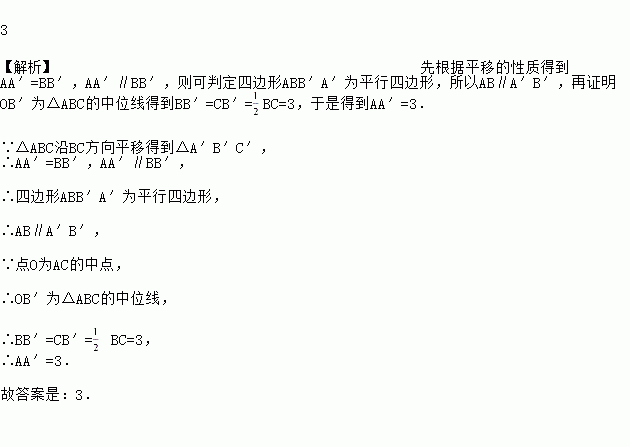 如图,在△ABC中,BC=6,将△ABC沿BC方向平移得到△A′B′C′,连接AA′,若A′B′恰好经过AC的中点O,则AA′的长度为______.