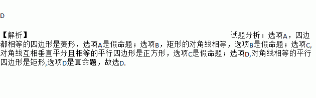 D ¡¾½âÎö¡¿ÊÔÌâ·ÖÎö£ºÑ¡ÏîA£¬Ëı߶¼ÏàµÈµÄËıßÐÎÊÇÁâÐΣ¬Ñ¡ÏîAÊǼÙÃüÌ⣻ѡÏîB£¬¾ØÐεĶԽÇÏßÏàµÈ£¬Ñ¡ÏîBÊǼÙÃüÌ⣻ѡÏîC,¶Ô½ÇÏß»¥Ïഹֱƽ·ÖÇÒÏàµÈµÄƽÐÐËıßÐÎÊÇÕý·½ÐΣ¬Ñ¡ÏîCÊǼÙÃüÌ⣻ѡÏîD,¶Ô½ÇÏßÏàµÈµÄƽÐÐËıßÐÎÊǾØÐÎ,Ñ¡ÏîDÊÇÕæÃüÌ⣬¹ÊÑ¡D.