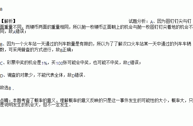 A. 抛一枚硬币正面朝上的机会与抛一枚图钉钉尖着地的机会一样大;