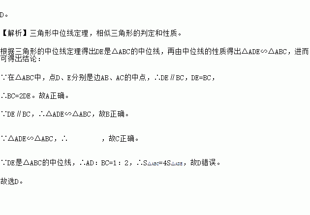 如图,在△ABC中,点D、E分别是AB、AC的中点,则下列结论不正确的是【 】