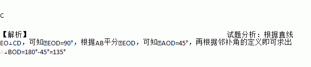 C 【解析】试题分析:根据直线EO⊥CD,可知∠EOD=90°,根据AB平分∠EOD,可知∠AOD=45°,再根据邻补角的定义即可求出∴∠BOD=180°-45°=135°
