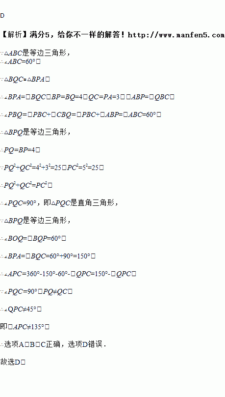 A. △BPQ是等边三角形 B. △PCQ是直角三角形 C. ∠APB=150° D. ∠APC=135°