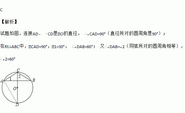如图,CD是⊙O的直径,已知∠1=30°,则∠2等于( )