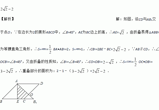如图,在边长为2的菱形ABCD中,∠B=45°,AE为BC边上的高,将△ABE沿AE所在直线翻折得△AB1E,则△AB1E与四边形AECD重叠部分的面积是_______.