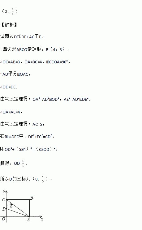 如图,四边形OABC为矩形,点A,C分别在x轴和y轴上,连接AC,点B的坐标为(4,3),∠CAO的平分线与y轴相交于点D,则点D的坐标为__________.