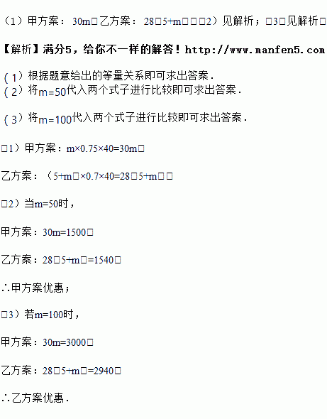 某社区的5名志愿者,在“十一”假期组织区内的未成年学生到公园秋游,公园的门票为每人40元.现有两种优方案,甲方案:志愿者免费,未成年学生按7.5折收费;乙方案:志愿者和未成年学生都按7折收费,若有m名未成年学生.