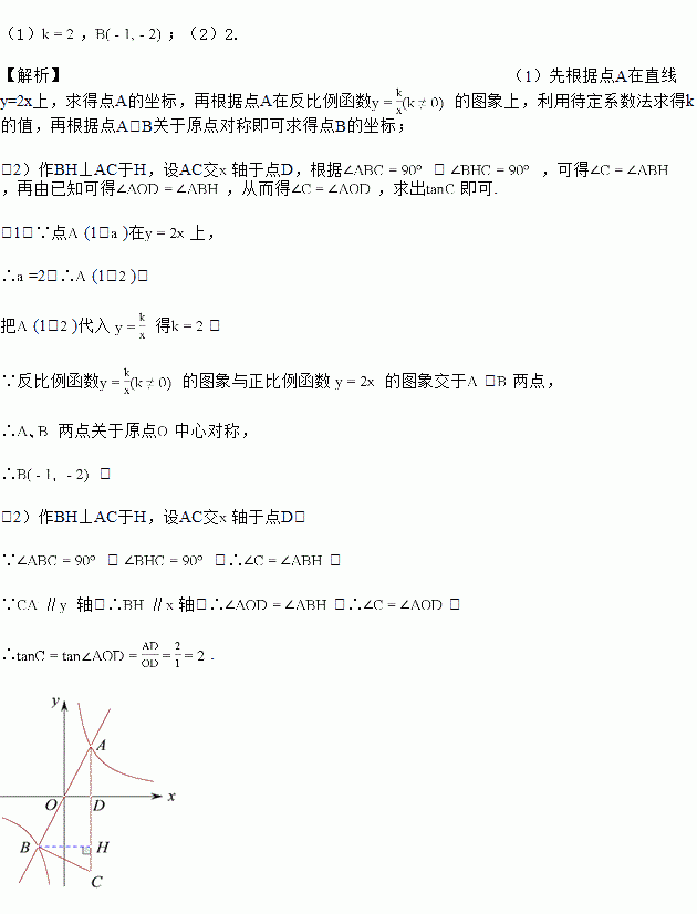 如图,反比例函数 的图象与正比例函数 的图象相交于(1,),两点,点在第四象限,∥ 轴,.