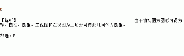 B 【解析】由于俯视图为圆形可得为球、圆柱、圆锥。主视图和左视图为三角形可得此几何体为圆锥。 故选:B.