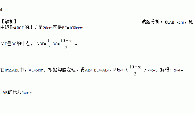 如图,在矩形ABCD中,E是BC的中点,矩形ABCD的周长是20 cm,AE=5 cm,则AB的长为____cm.