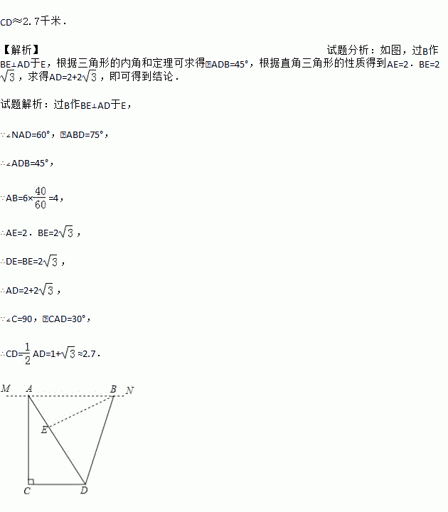 如图,地面上两个村庄C、D处于同一水平线上,一飞行器在空中以6千米/小时的速度沿MN方向水平飞行,航线MN与C、D在同一铅直平面内.当该飞行器飞行至村庄C的正上方A处时,测得∠NAD=60°;该飞行器从A处飞行40分钟至B处时,测得∠ABD=75°.求村庄C、D间的距离(